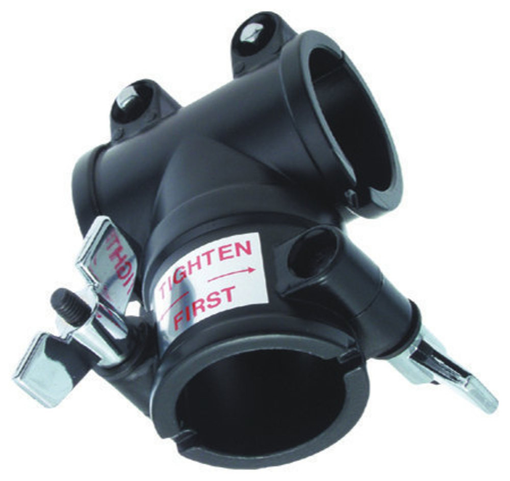 Power-Rack T-láb clamp;tartós műanyag;T-konstrukcióhoz;két rack cső csatlakoztatására egy álló tamhoz;90° szög ;jó 1,5" (3,81 cm) átmérőjű rack csőhöz; Fekete
